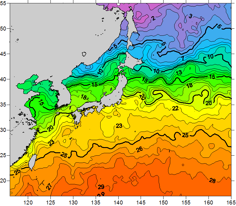 o 2010년 11월 27일 북서태평양 광역해양 수온분포 입니다. o 아래 위성 수온분포도는 국립수산과학원(NFRDI, Korea)과 일본동북대학교 (Tohoku University, Japan)가 공동연구개발 진행중, 1차 연구결과인 것으로 구름의 영향을 배제한 신기술의 수온정보입니다.