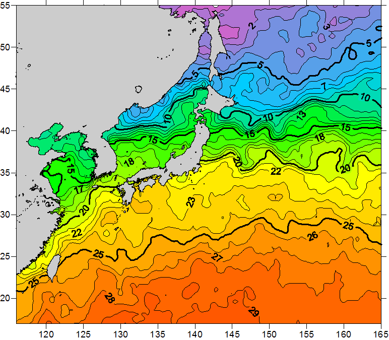 o 2010년 11월 28일 북서태평양 광역해양 수온분포 입니다. o 아래 위성 수온분포도는 국립수산과학원(NFRDI, Korea)과 일본동북대학교 (Tohoku University, Japan)가 공동연구개발 진행중, 1차 연구결과인 것으로 구름의 영향을 배제한 신기술의 수온정보입니다.