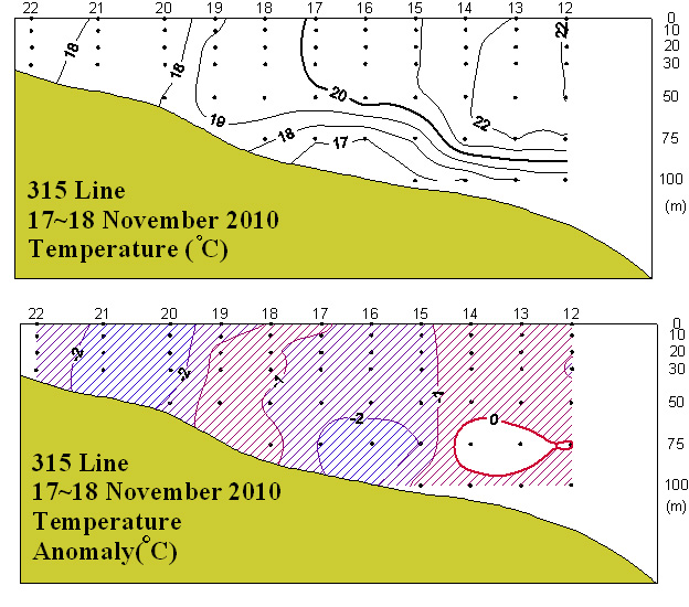 ㅇ 2010년 11월 17~18일 국립수산과학원 남서해수산연구소에서 조사한 동중국해 북부해역(315선)의 수온 수직분포도와 평년편차도입니다.