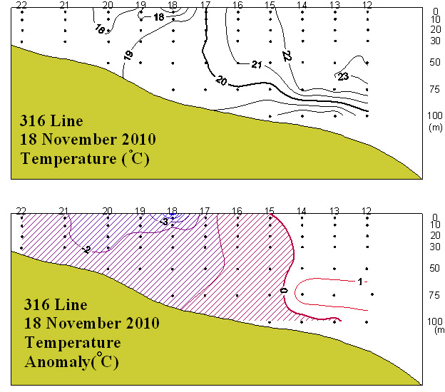 ㅇ 2010년 11월 18일 국립수산과학원 남서해수산연구소에서 조사한 동중국해 북부해역(316선)의 수온 수직분포도와 평년편차도입니다.
