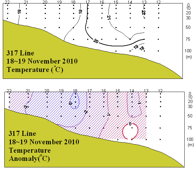 ㅇ 2010년 11월 18~19일 국립수산과학원 남서해수산연구소에서 조사한 동중국해 북부해역(317선)의 수온 수직분포도와 평년편차도입니다.
