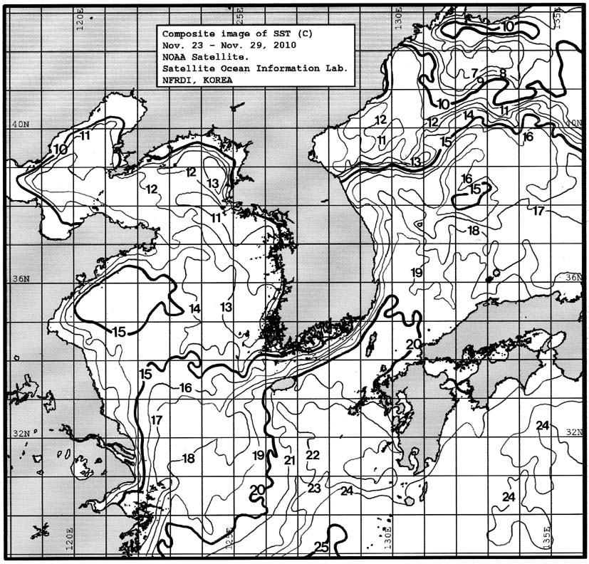 o 금주(2010.11.23~2010.11.29)의 한국근해 표면수온은 대화퇴 근해 15~16도, 울릉도 근해 16~17도, 대마도 근해 20~21도, 제주도 근해 19~21도, 이어도 근해 17~18도, 가거초 근해 14~15도, 어청도 근해 11~12도로 나타납니다. o「평년에 비해」대화퇴 근해 1.7도 높게, 울릉도 근해 비슷하게, 대마도 근해 0.5도 높게, 제주도 근해 0.3도 높게, 이어도 근해 1.2도 낮게, 가거초 근해 0.6도 낮게, 어청도 근해는 2.0도 낮게 나타납니다. o「전년에 비해」대화퇴 근해 1.5도 낮게, 울릉도 근해 0.5도 높게, 대마도 근해 1.0도 높게, 제주도 근해 1.0도 낮게, 이어도 근해 2.0도 낮게, 가거초 근해 1.0도 낮게, 어청도 근해는 2.0도 낮게 나타납니다. o 수온 전선대는 우리나라 제주해협에서 대한해협까지 18도를 중심으로 형성됩니다.