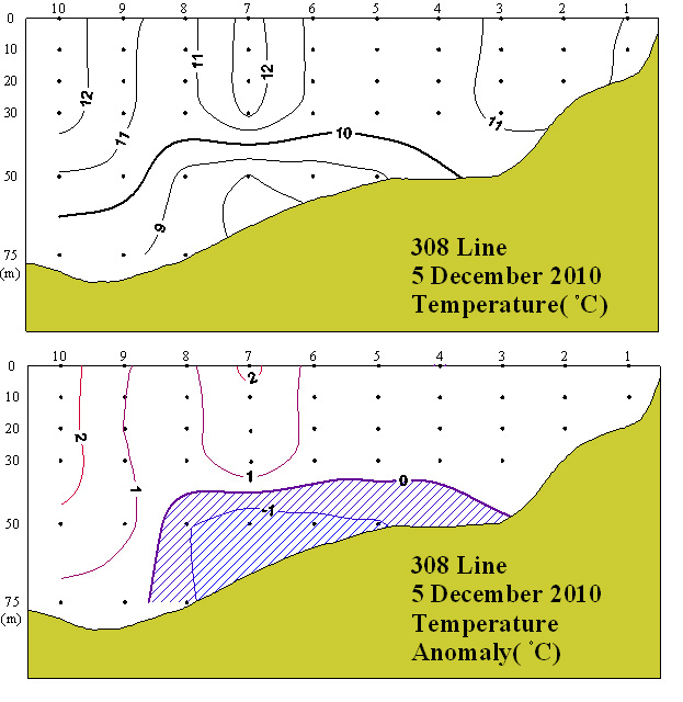 ㅇ 2010년 12월 5일 국립수산과학원 서해수산연구소에서 조사한 308선(대천 서방)의 수직수온분포도 및 평년편차도입니다.