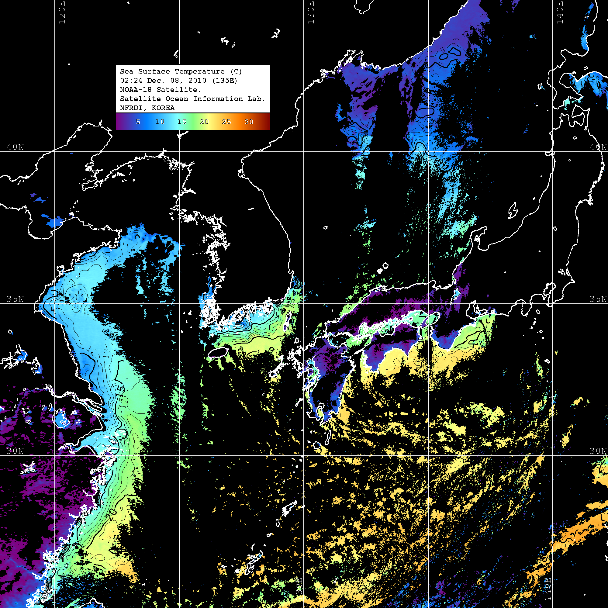 o 2010년 12월 08일 02시 24분 NOAA-18호 위성영상입니다. o 수온분포는 범례를 참고하시기 바랍니다. o 검은색은 구름을 나타냅니다. o 그림을 클릭하시면 크게 보실 수 있습니다.