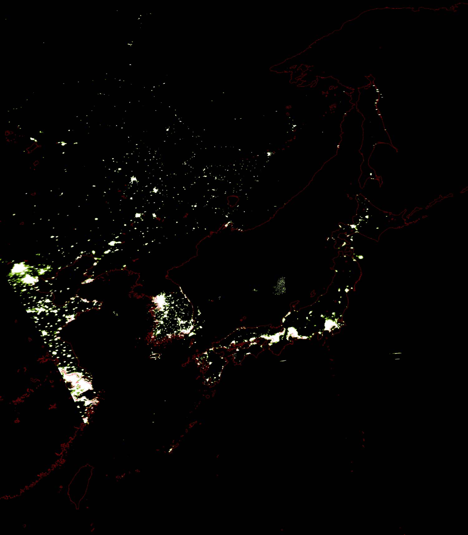 o 2010년 12월 07일 19시 34분 DMSP/OLS(Detense Meteorological Satellite Program/Operating Linescan System) 영상입니다. o DMSP/OLS는 야간 불빛을 탐지하는 위성으로, 야간 조업 어선 분포 현황을 알 수 있습니다. o 그림을 클릭하시면 크게 보실 수 있습니다.