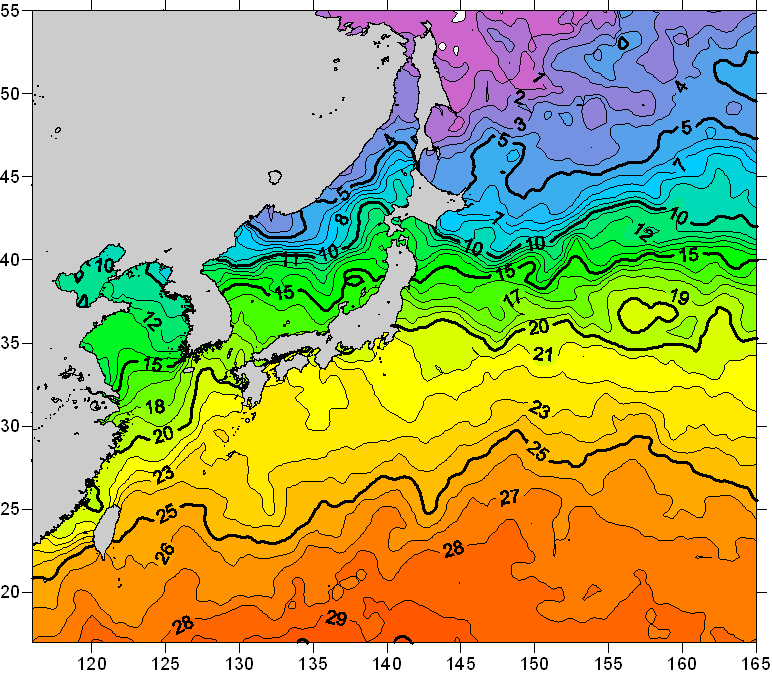 o 2010년 12월 09일 북서태평양 광역해양 수온분포 입니다. o 아래 위성 수온분포도는 국립수산과학원(NFRDI, Korea)과 일본동북대학교 (Tohoku University, Japan)가 공동연구개발 진행중, 1차 연구결과인 것으로 구름의 영향을 배제한 신기술의 수온정보입니다.