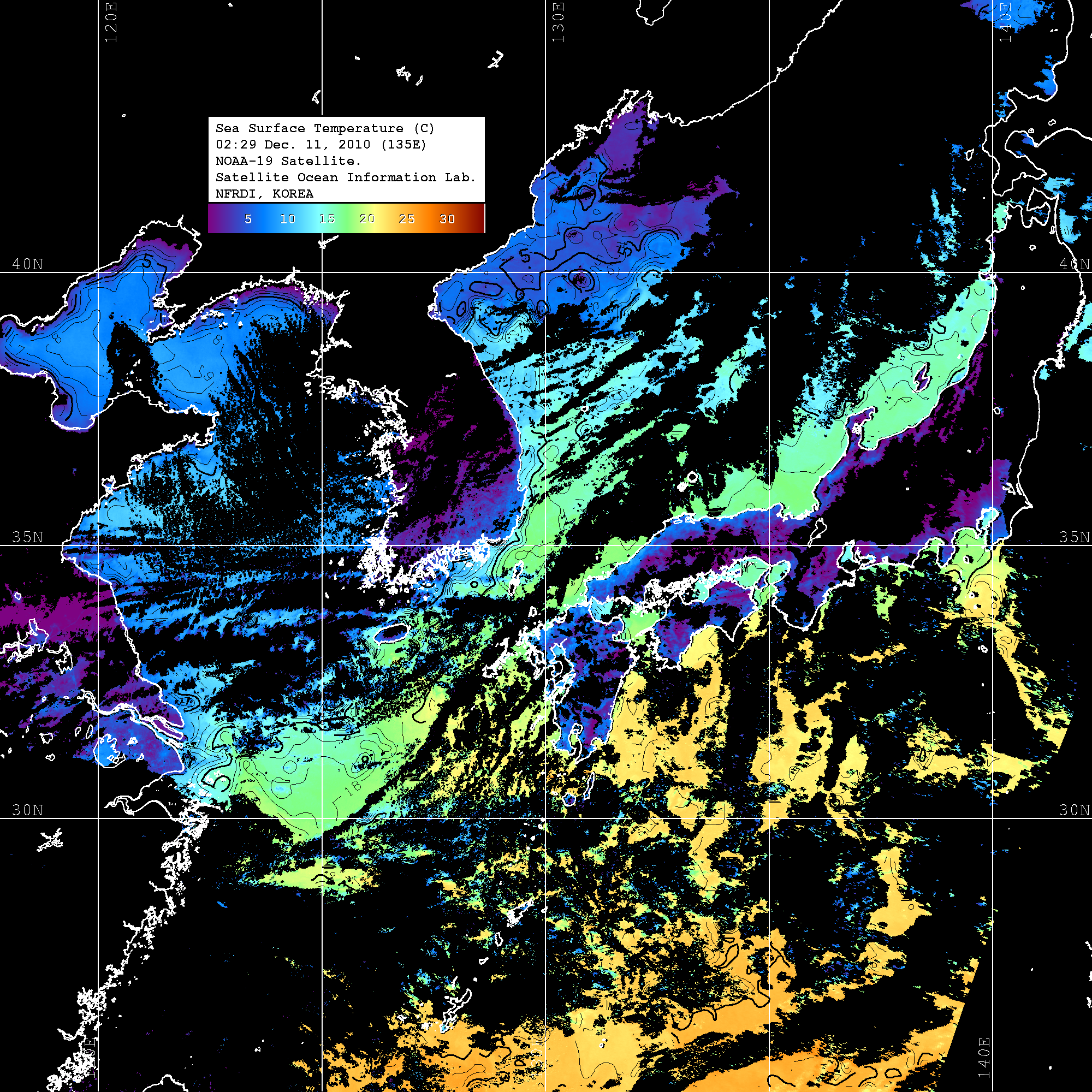 o 2010년 12월 11일 02시 29분 NOAA-19호 위성영상입니다. o 수온분포는 범례를 참고하시기 바랍니다. o 검은색은 구름을 나타냅니다. o 그림을 클릭하시면 크게 보실 수 있습니다.