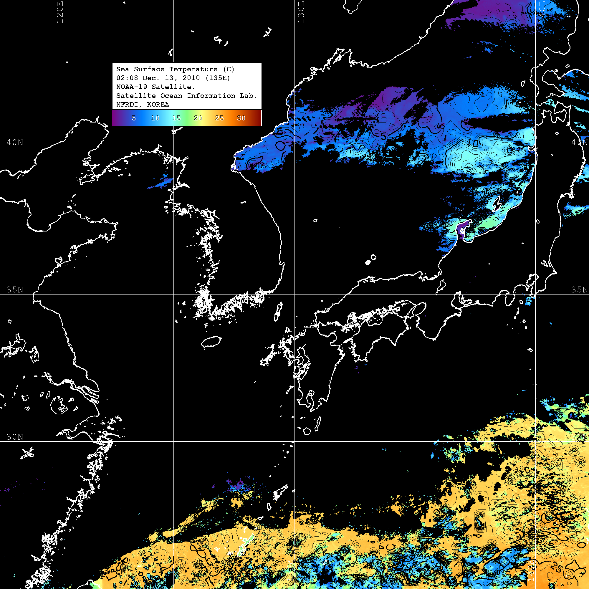 o 2010년 12월 13일 02시 08분 NOAA-19호 위성영상입니다. o 수온분포는 범례를 참고하시기 바랍니다. o 검은색은 구름을 나타냅니다. o 그림을 클릭하시면 크게 보실 수 있습니다.