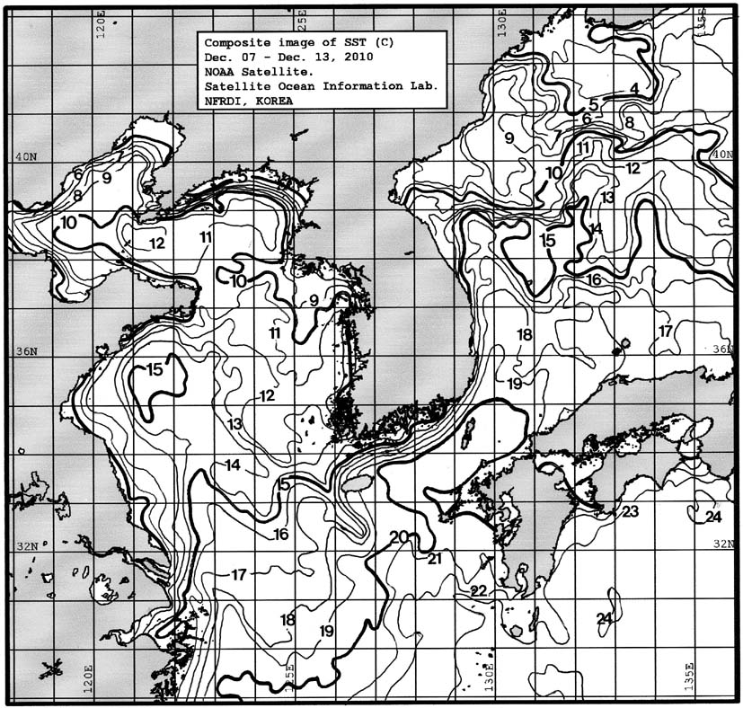 o 금주(2010.12.07~2010.12.13)의 한국근해 표면수온은 대화퇴 근해 10~12도, 울릉도 근해 14~16도, 대마도 근해 19~20도, 제주도 근해 18~20도, 이어도 근해 16~17도, 가거초 근해 12~13도, 어청도 근해 11~12도로 나타납니다. o「평년에 비해」대화퇴 근해 1.5도 낮게, 울릉도 근해 1.0도 낮게, 대마도 근해 0.4도 높게, 제주도 근해 0.4도 낮게, 이어도 근해 0.9도 낮게, 가거초 근해 1.7도 낮게, 어청도 근해는 0.4도 낮게 나타납니다. o「전년에 비해」대화퇴 근해 4.0도 낮게, 울릉도 근해 비슷하게, 대마도 근해 1.5도 높게, 제주도 근해 1.0도 낮게, 이어도 근해 0.5도 낮게, 가거초 근해 2.5도 낮게, 어청도 근해는 0.5도 낮게 나타납니다. o 수온 전선대는 우리나라 제주해협에서 대한해협까지 18도를 중심으로 형성됩니다.