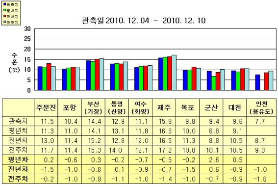 o 금주(2010.12.04~2010.12.10)의 한반도 연안 표면수온은 동해 연안역에서 섭씨 10.0~14.5도, 남해 연안역 11.0~16.0도, 서해 연안역에서 7.5~10.0도로 나타납니다. o 평년에 비해 포항 0.6도 낮음을 제외한 동해 연안역은 비슷하게, 남해 연안역은 0.5~1.0도 낮게, 목포 비슷함을 제외한 서해 연안역은 0.5~2.5도 높게 나타납니다. o 전년에 비해 동해 연안역은 0.5~1.5도 낮게, 통영(산양) 비슷함을 제외한 남해 연안역은 0.5~1.0도 낮게, 군산 0.6도 높음을 제외한 서해 연안역은 0.5~1.5도 낮게 나타납니다.