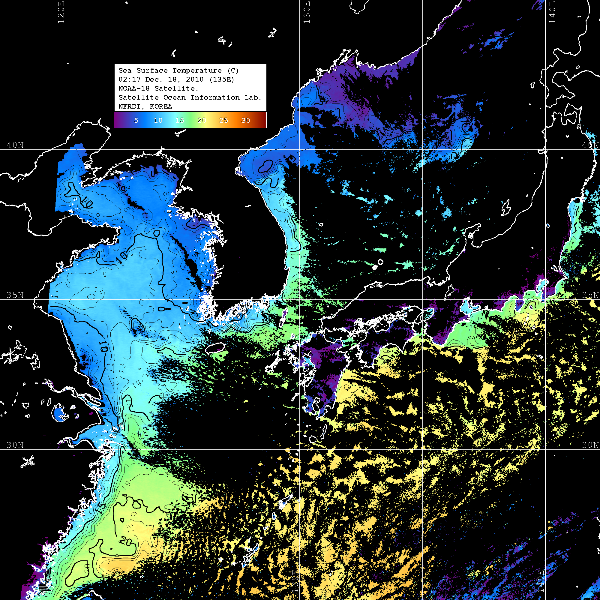 o 2010년 12월 18일 02시 17분 NOAA-18호 위성영상입니다. o 수온분포는 범례를 참고하시기 바랍니다. o 검은색은 구름을 나타냅니다. o 그림을 클릭하시면 크게 보실 수 있습니다.