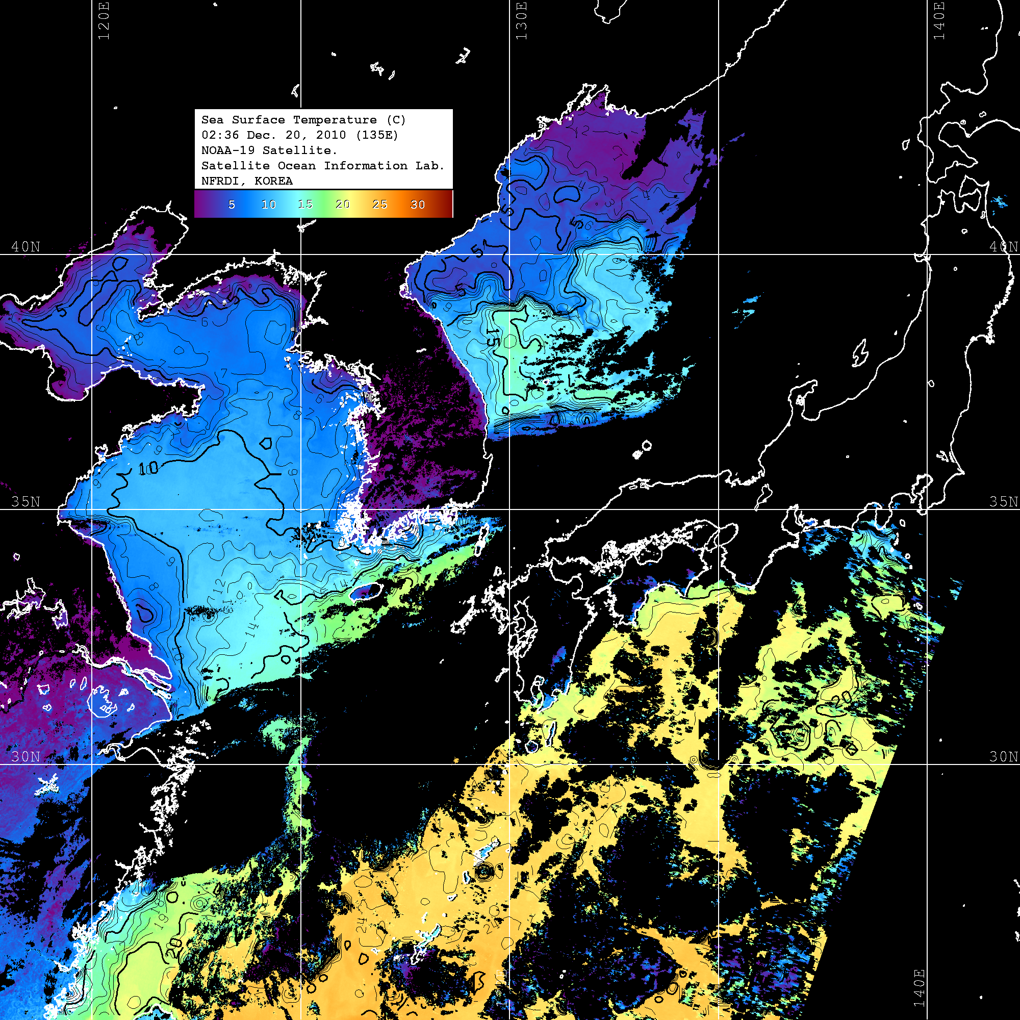 o 2010년 12월 20일 02시 36분 NOAA-19호 위성영상입니다. o 수온분포는 범례를 참고하시기 바랍니다. o 검은색은 구름을 나타냅니다. o 그림을 클릭하시면 크게 보실 수 있습니다.