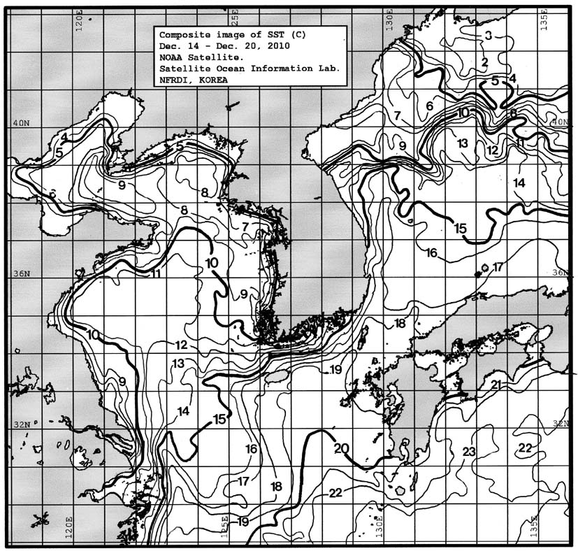 o 금주(2010.12.14~2010.12.20)의 한국근해 표면수온은 대화퇴 근해 9~10도, 울릉도 근해 15~16도, 대마도 근해 18~19도, 제주도 근해 17~19도, 이어도 근해 15~16도, 가거초 근해 11~13도, 어청도 근해 8~9도로 나타납니다. o「평년에 비해」대화퇴 근해 1.4도 낮게, 울릉도 근해 0.3도 낮게, 대마도 근해 0.2도 낮게, 제주도 근해 비슷하게, 이어도 근해 0.6도 낮게, 가거초 근해 1.5도 낮게, 어청도 근해는 2.2도 낮게 나타납니다. o「전년에 비해」대화퇴 근해 1.0도 높게, 울릉도 근해 2.5도 높게, 대마도 근해 1.0도 낮게, 제주도 근해 비슷하게, 이어도 근해 비슷하게, 가거초 근해 1.5도 낮게, 어청도 근해는 비슷하게 나타납니다. o 수온 전선대는 우리나라 제주해협에서 대한해협까지 17도를 중심으로 형성됩니다.