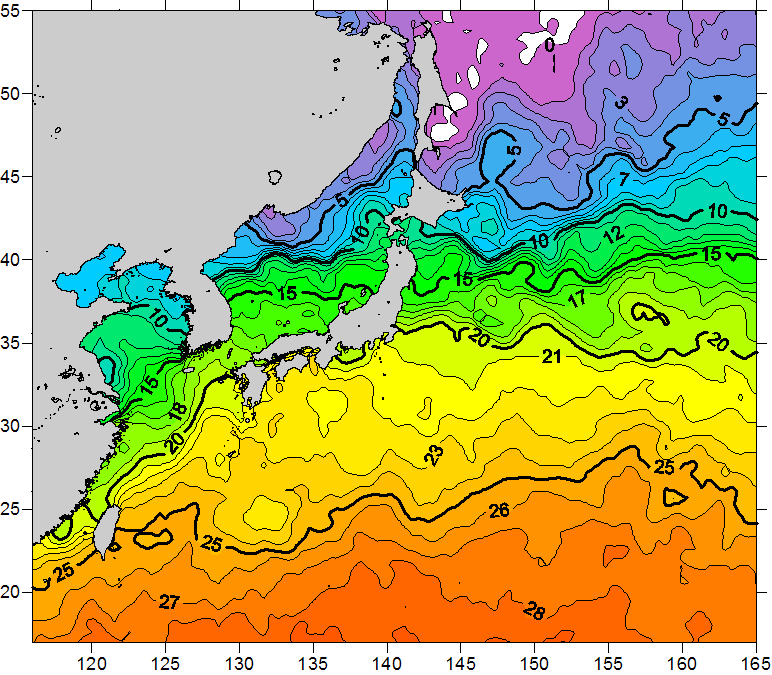 o 2010년 12월 20일 북서태평양 광역해양 수온분포 입니다. o 아래 위성 수온분포도는 국립수산과학원(NFRDI, Korea)과 일본동북대학교 (Tohoku University, Japan)가 공동연구개발 진행중, 1차 연구결과인 것으로 구름의 영향을 배제한 신기술의 수온정보입니다.