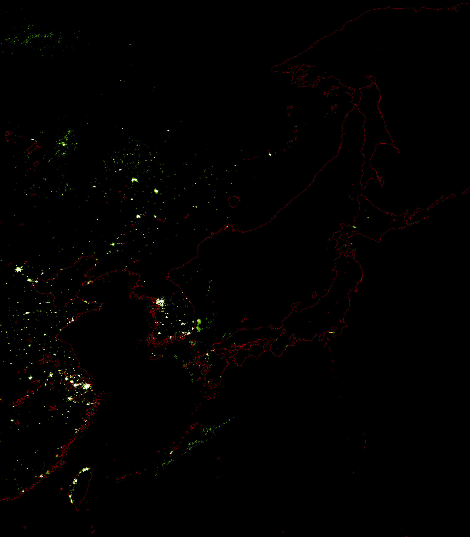 o 2010년 12월 21일 20시 09분 DMSP/OLS(Detense Meteorological Satellite Program/Operating Linescan System) 영상입니다. o DMSP/OLS는 야간 불빛을 탐지하는 위성으로, 야간 조업 어선 분포 현황을 알 수 있습니다. o 그림을 클릭하시면 크게 보실 수 있습니다.