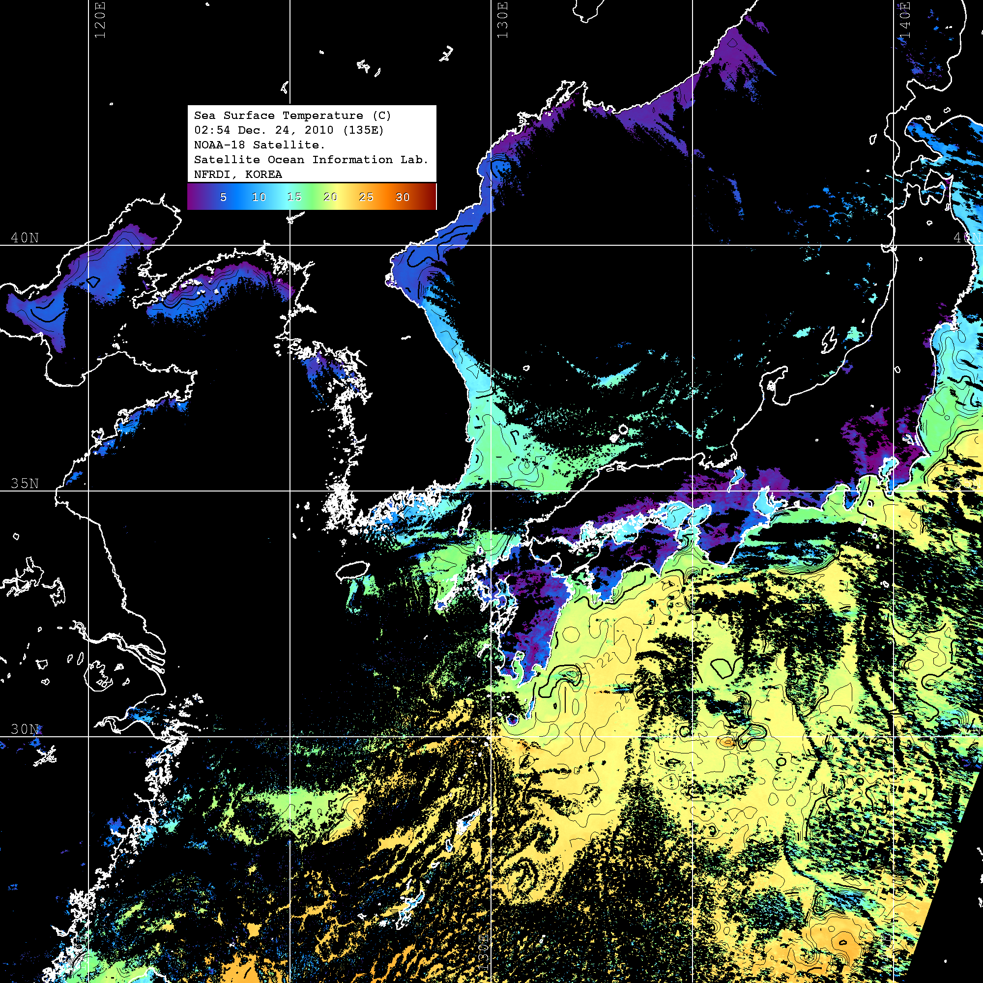 o 2010년 12월 24일 02시 54분 NOAA-18호 위성영상입니다. o 수온분포는 범례를 참고하시기 바랍니다. o 검은색은 구름을 나타냅니다. o 그림을 클릭하시면 크게 보실 수 있습니다.
