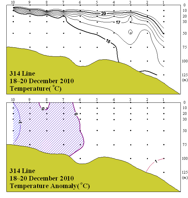 ㅇ 2010년 12월 18 ∼ 20 일 국립수산과학원 남서해수산연구소에서 조사한 314선(제주 남부해역)의 수직수온분포도 및 평년편차도 입니다.
