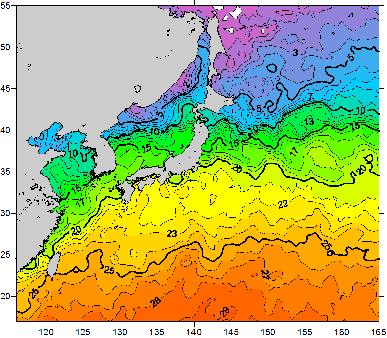 o 2010년 12월 24일 북서태평양 광역해양 수온분포 입니다. o 아래 위성 수온분포도는 국립수산과학원(NFRDI, Korea)과 일본동북대학교 (Tohoku University, Japan)가 공동연구개발 진행중, 1차 연구결과인 것으로 구름의 영향을 배제한 신기술의 수온정보입니다.