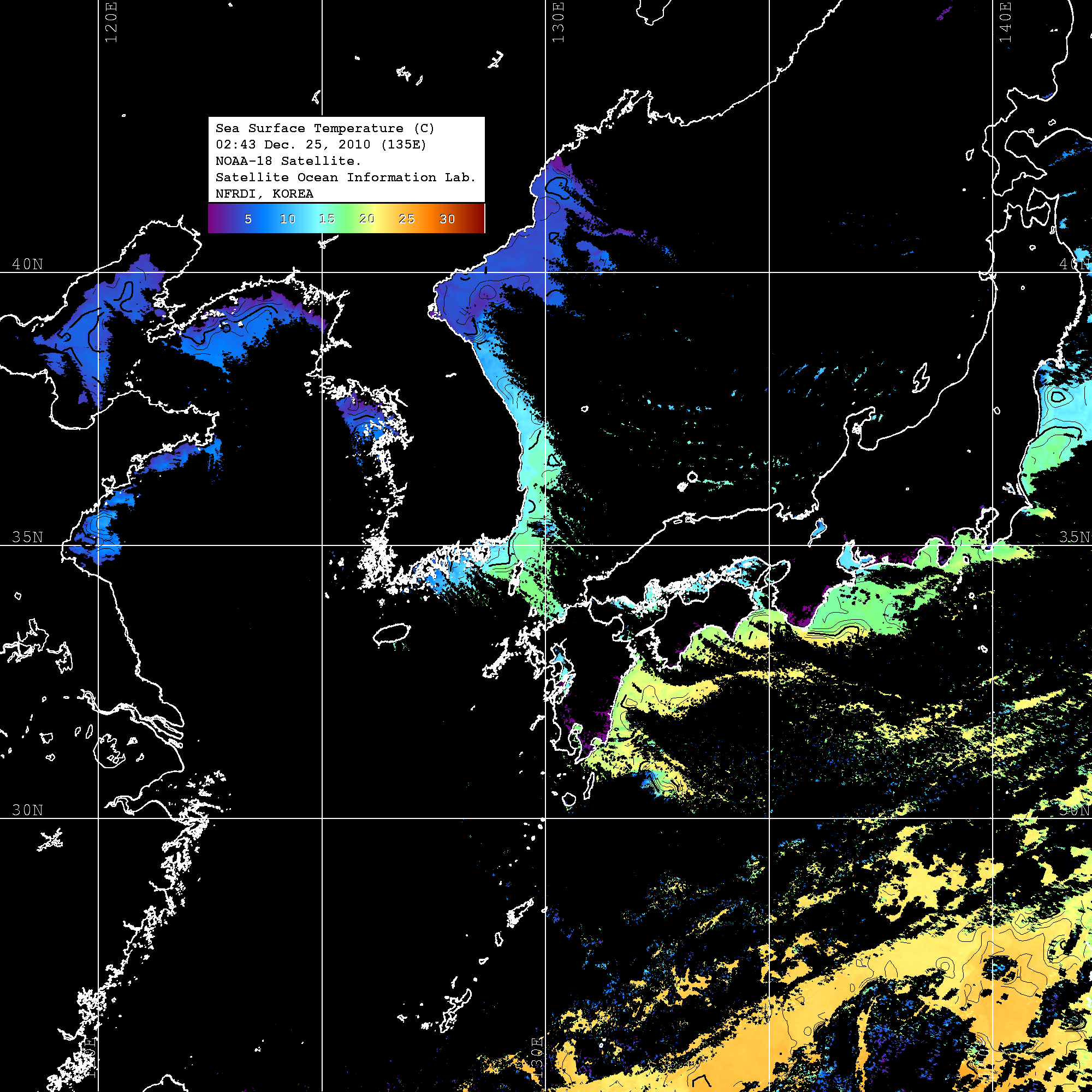 o 2010년 12월 25일 02시 43분 NOAA-18호 위성영상입니다. o 수온분포는 범례를 참고하시기 바랍니다. o 검은색은 구름을 나타냅니다. o 그림을 클릭하시면 크게 보실 수 있습니다.