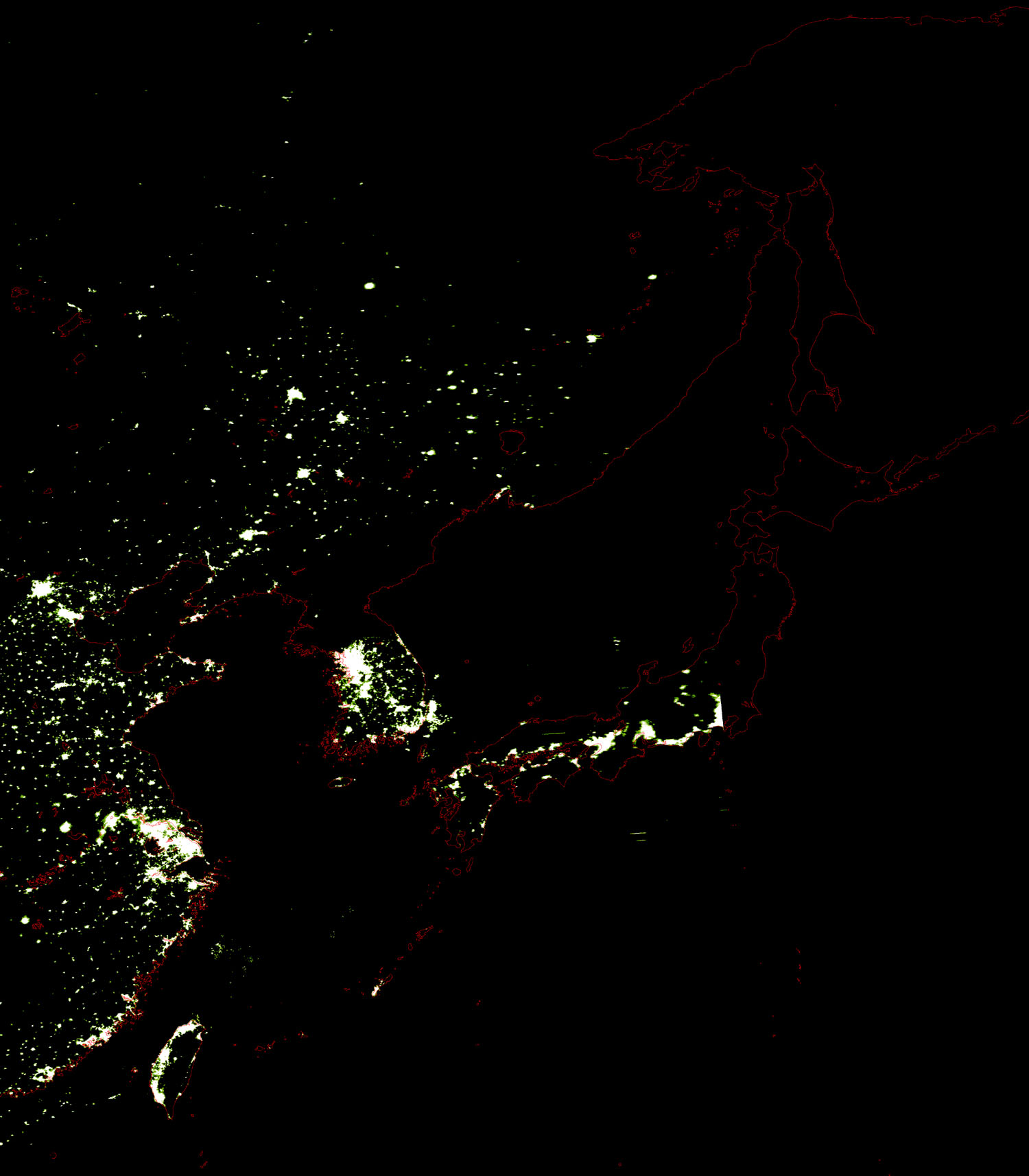 o 2010년 12월 28일 20시 26분 DMSP/OLS(Detense Meteorological Satellite Program/Operating Linescan System) 영상입니다. o DMSP/OLS는 야간 불빛을 탐지하는 위성으로, 야간 조업 어선 분포 현황을 알 수 있습니다. o 그림을 클릭하시면 크게 보실 수 있습니다.