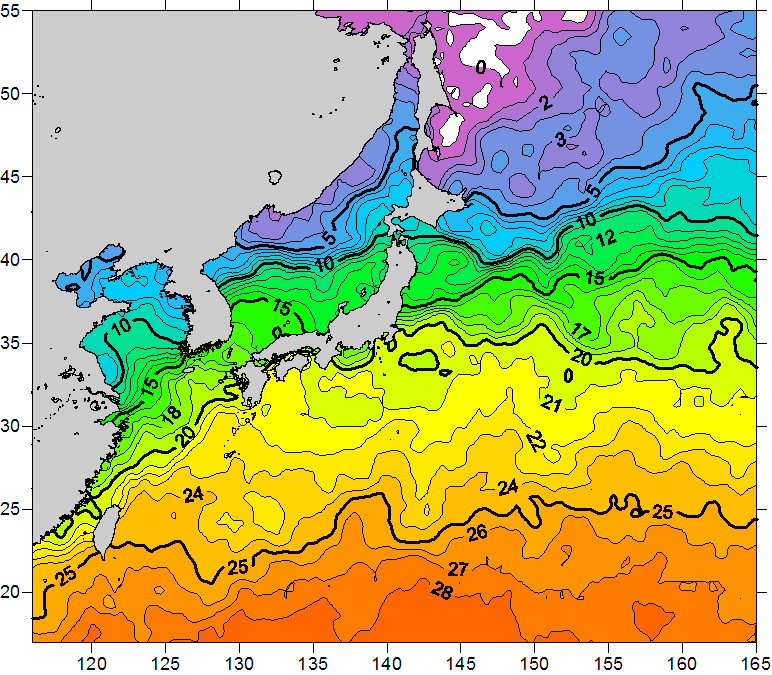o 2010년 12월 28일 북서태평양 광역해양 수온분포 입니다. o 아래 위성 수온분포도는 국립수산과학원(NFRDI, Korea)과 일본동북대학교 (Tohoku University, Japan)가 공동연구개발 진행중, 1차 연구결과인 것으로 구름의 영향을 배제한 신기술의 수온정보입니다.