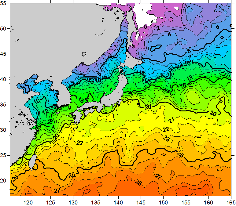 o 2010년 12월 30일 북서태평양 광역해양 수온분포 입니다. o 아래 위성 수온분포도는 국립수산과학원(NFRDI, Korea)과 일본동북대학교 (Tohoku University, Japan)가 공동연구개발 진행중, 1차 연구결과인 것으로 구름의 영향을 배제한 신기술의 수온정보입니다.