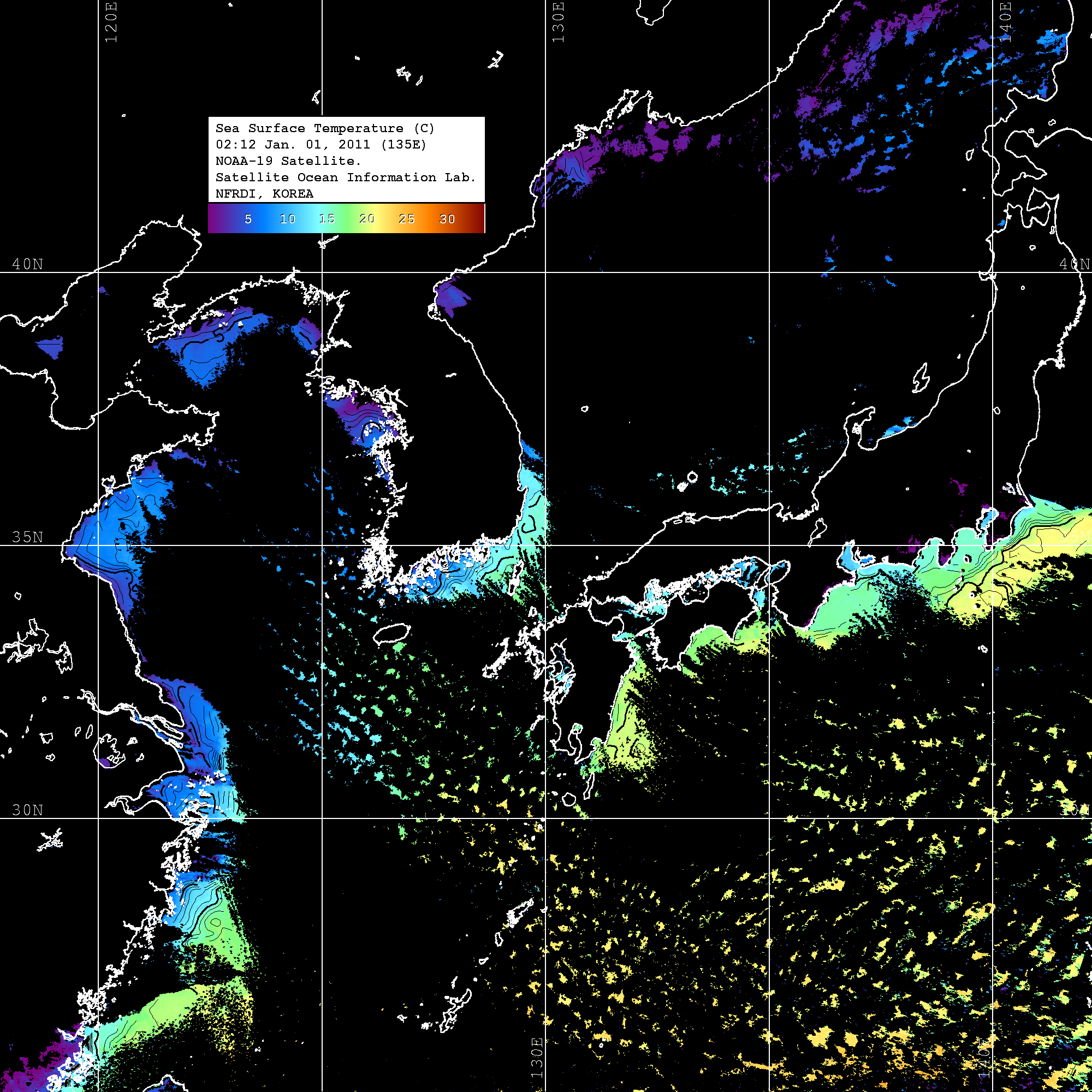 o 2011년 01월 01일 02시 12분 NOAA-19호 위성영상입니다. o 수온분포는 범례를 참고하시기 바랍니다. o 검은색은 구름을 나타냅니다. o 그림을 클릭하시면 크게 보실 수 있습니다.