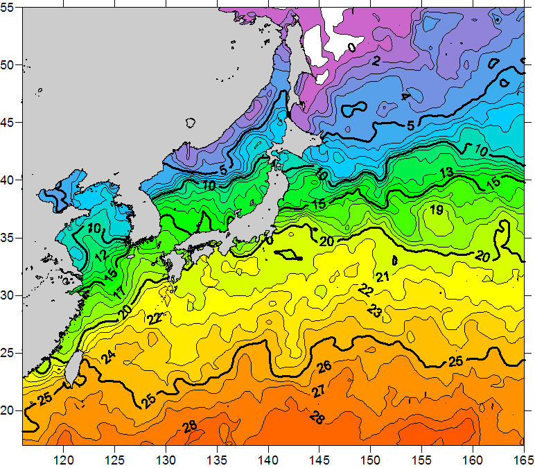 o 2010년 12월 31일 북서태평양 광역해양 수온분포 입니다. o 아래 위성 수온분포도는 국립수산과학원(NFRDI, Korea)과 일본동북대학교 (Tohoku University, Japan)가 공동연구개발 진행중, 1차 연구결과인 것으로 구름의 영향을 배제한 신기술의 수온정보입니다.