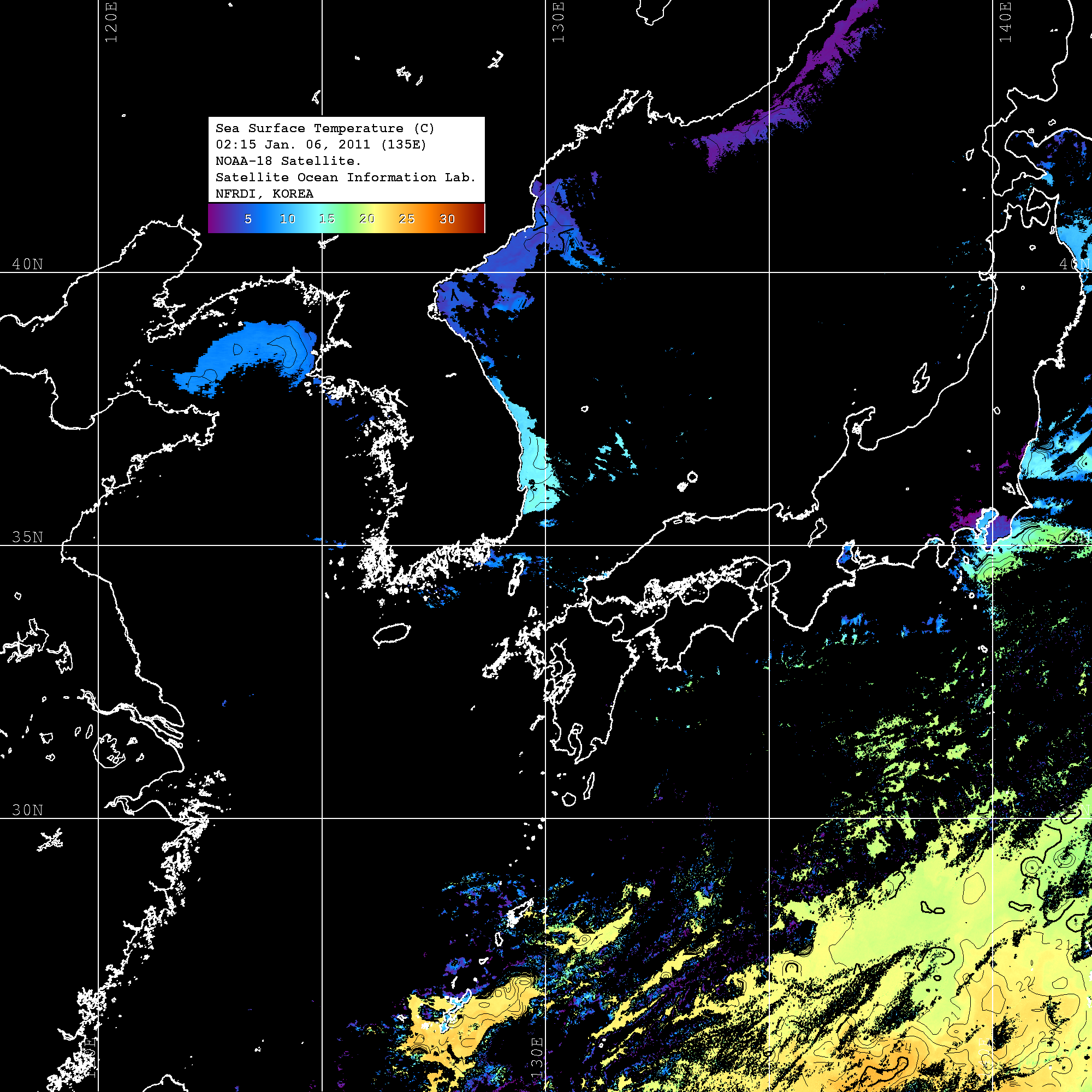 o 2011년 01월 06일 02시 15분 NOAA-18호 위성영상입니다. o 수온분포는 범례를 참고하시기 바랍니다. o 검은색은 구름을 나타냅니다. o 그림을 클릭하시면 크게 보실 수 있습니다.