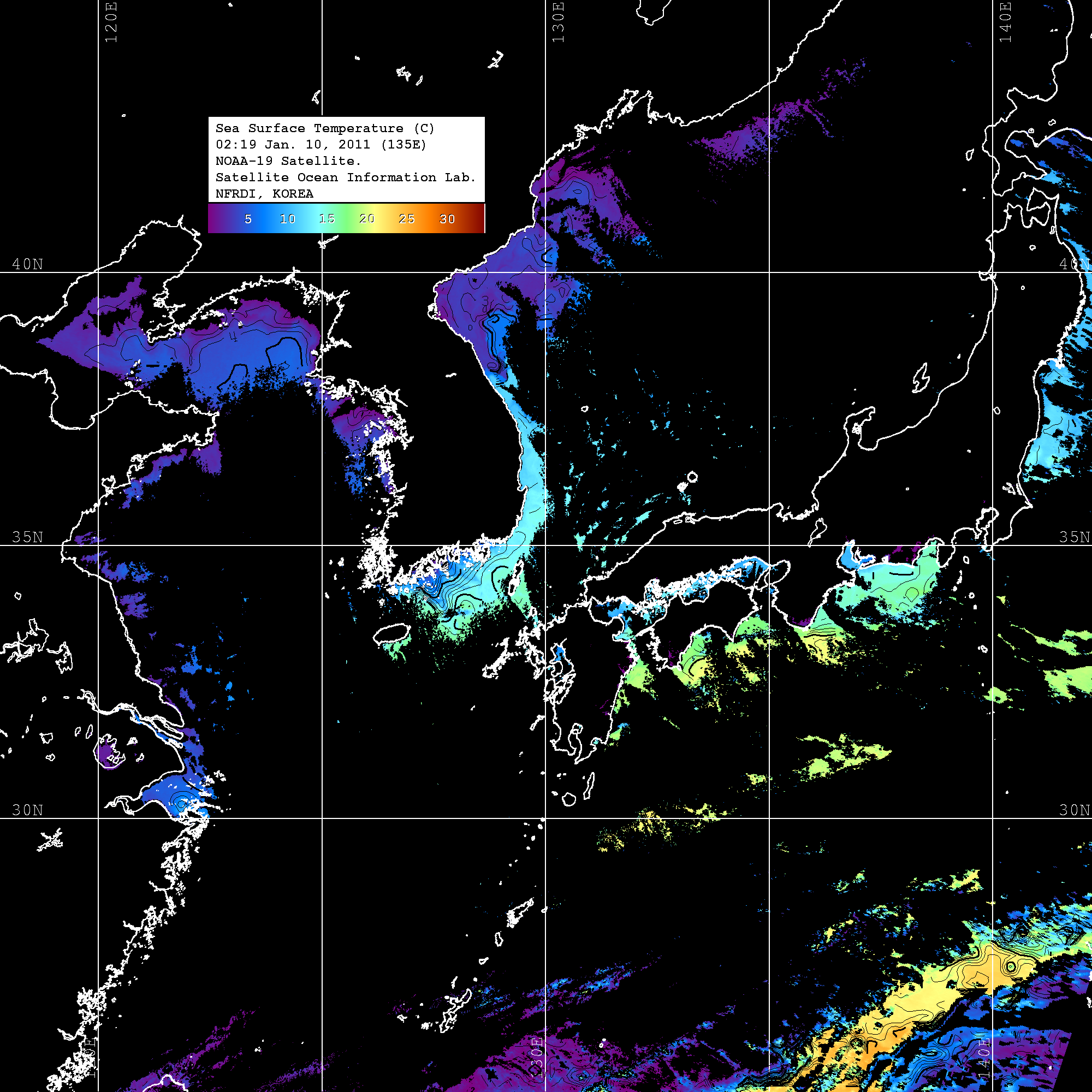 o 2011년 01월 10일 02시 19분 NOAA-19호 위성영상입니다. o 수온분포는 범례를 참고하시기 바랍니다. o 검은색은 구름을 나타냅니다. o 그림을 클릭하시면 크게 보실 수 있습니다.