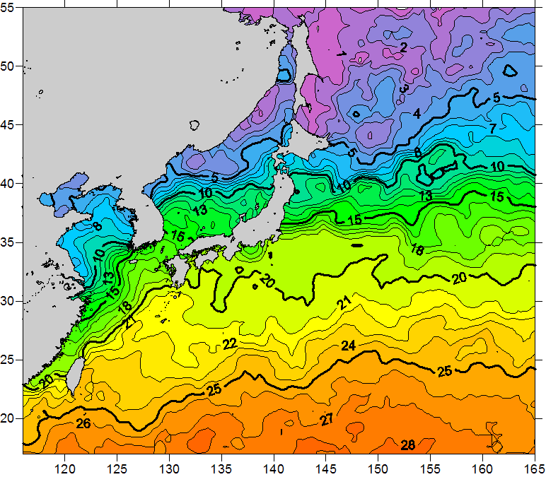 o 2011년 01월 07일 북서태평양 광역해양 수온분포 입니다. o 아래 위성 수온분포도는 국립수산과학원(NFRDI, Korea)과 일본동북대학교 (Tohoku University, Japan)가 공동연구개발 진행중, 1차 연구결과인 것으로 구름의 영향을 배제한 신기술의 수온정보입니다.