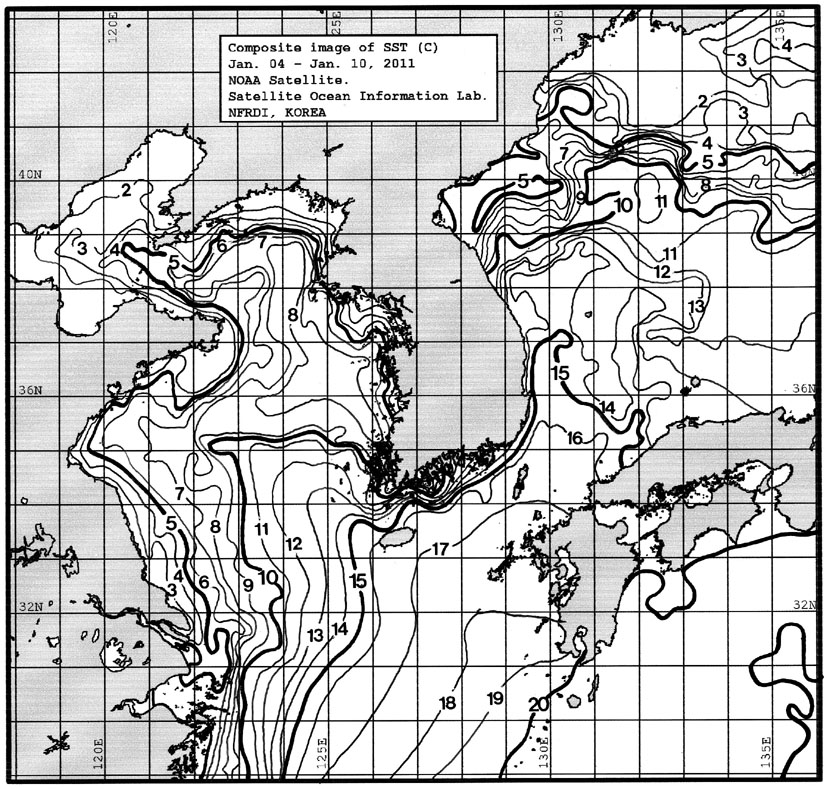 o 금주(2011.01.04~2011.01.10)의 한국근해 표면수온은 대화퇴 근해 7~8도, 울릉도 근해 13~14도, 대마도 근해 16~17도, 제주도 근해 15~17도, 이어도 근해 13~14도, 가거초 근해 13~14도, 어청도 근해 6~7도로 나타납니다. o「평년에 비해」대화퇴 근해 1.8도 낮게, 울릉도 근해 0.6도 높게, 대마도 근해 0.3도 낮게, 제주도 근해 비슷하게, 이어도 근해 비슷하게, 가거초 근해 1.8도 높게, 어청도 근해는 1.5도 낮게 나타납니다. o「전년에 비해」대화퇴 근해 2.5도 낮게, 울릉도 근해 2.0도 높게, 대마도 근해 0.5도 낮게, 제주도 근해 비슷하게, 이어도 근해 1.0도 높게, 가거초 근해 3.0도 높게, 어청도 근해는 0.5도 낮게 나타납니다. o 수온 전선대는 우리나라 제주해협에서 대한해협까지 15도를 중심으로 형성됩니다.