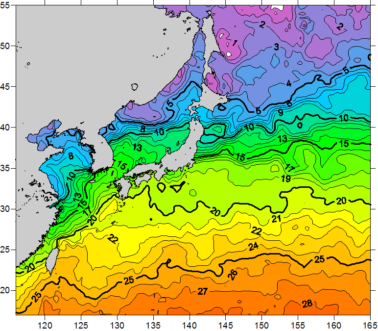 o 2011년 01월 11일 북서태평양 광역해양 수온분포 입니다. o 아래 위성 수온분포도는 국립수산과학원(NFRDI, Korea)과 일본동북대학교 (Tohoku University, Japan)가 공동연구개발 진행중, 1차 연구결과인 것으로 구름의 영향을 배제한 신기술의 수온정보입니다.