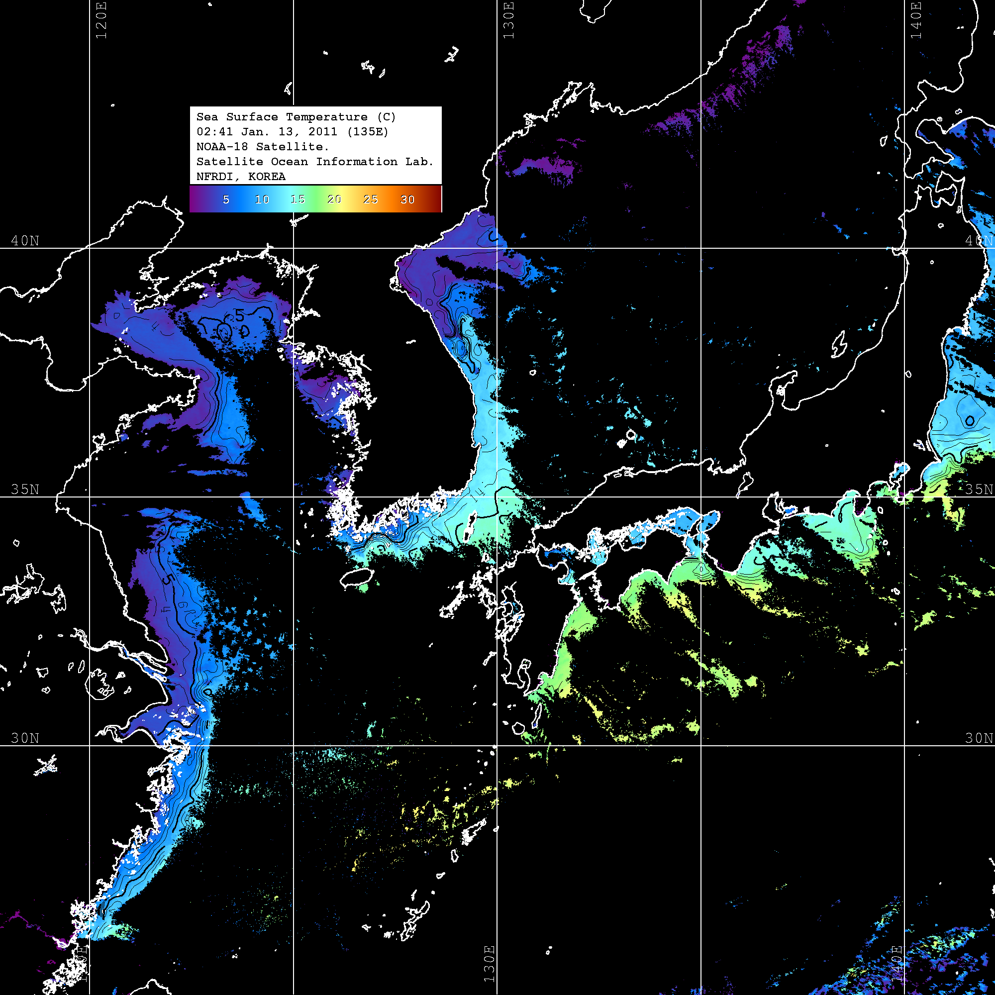 o 2011년 01월 13일 02시 41분 NOAA-18호 위성영상입니다. o 수온분포는 범례를 참고하시기 바랍니다. o 검은색은 구름을 나타냅니다. o 그림을 클릭하시면 크게 보실 수 있습니다.