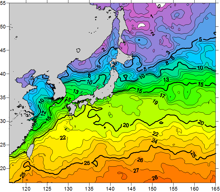 o 2011년 01월 14일 북서태평양 광역해양 수온분포 입니다. o 아래 위성 수온분포도는 국립수산과학원(NFRDI, Korea)과 일본동북대학교 (Tohoku University, Japan)가 공동연구개발 진행중, 1차 연구결과인 것으로 구름의 영향을 배제한 신기술의 수온정보입니다.