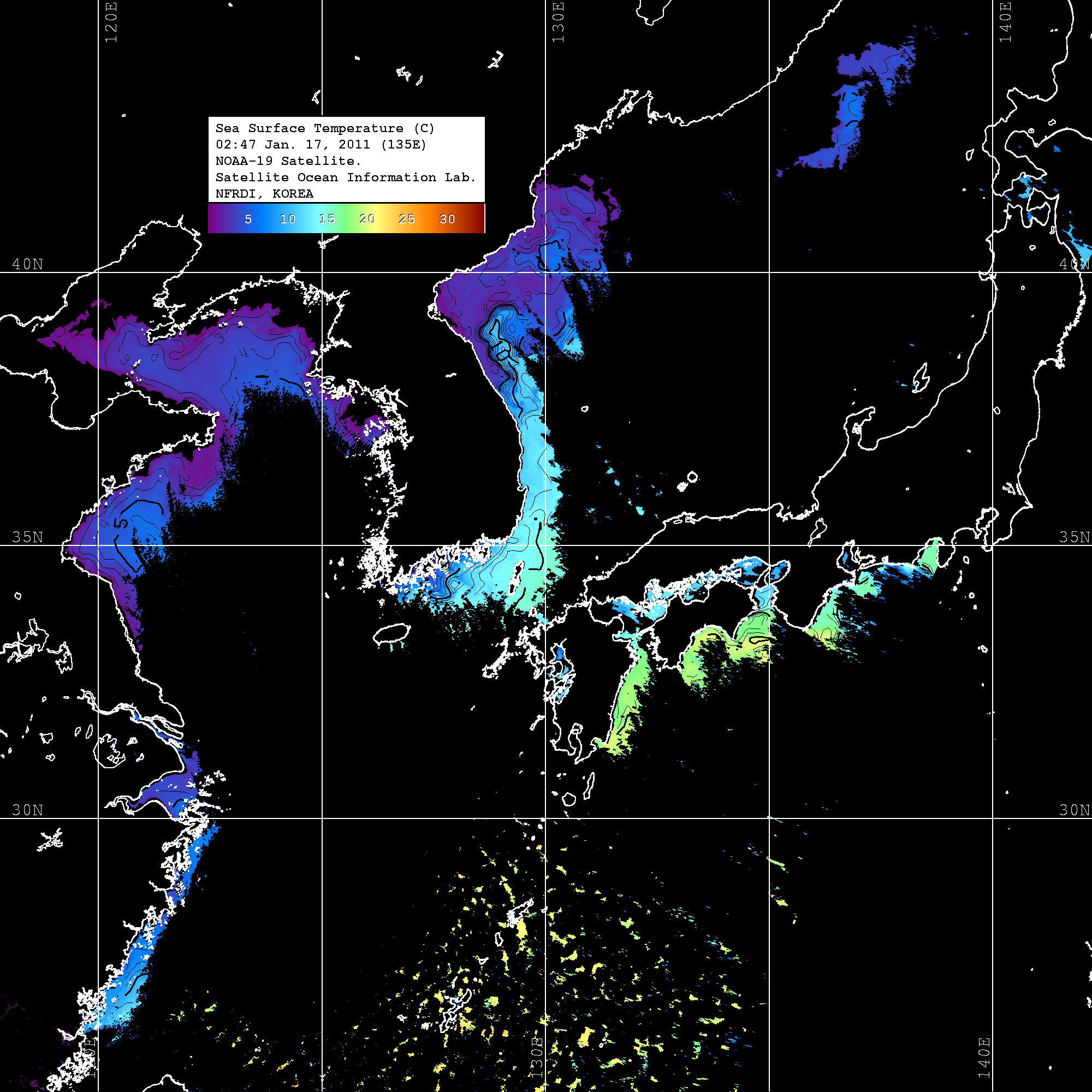 o 2011년 01월 17일 02시 47분 NOAA-19호 위성영상입니다. o 수온분포는 범례를 참고하시기 바랍니다. o 검은색은 구름을 나타냅니다. o 그림을 클릭하시면 크게 보실 수 있습니다.