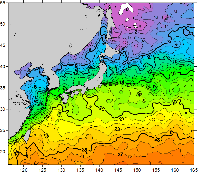 o 2011년 01월 17일 북서태평양 광역해양 수온분포 입니다. o 아래 위성 수온분포도는 국립수산과학원(NFRDI, Korea)과 일본동북대학교 (Tohoku University, Japan)가 공동연구개발 진행중, 1차 연구결과인 것으로 구름의 영향을 배제한 신기술의 수온정보입니다.