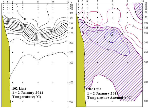 ㅇ 2011년 1월 1 ∼ 2일 국립수산과학원 동해수산연구소에서 조사한 102선(포항 동방)의 수직수온분포도 및 평년편차도 입니다.