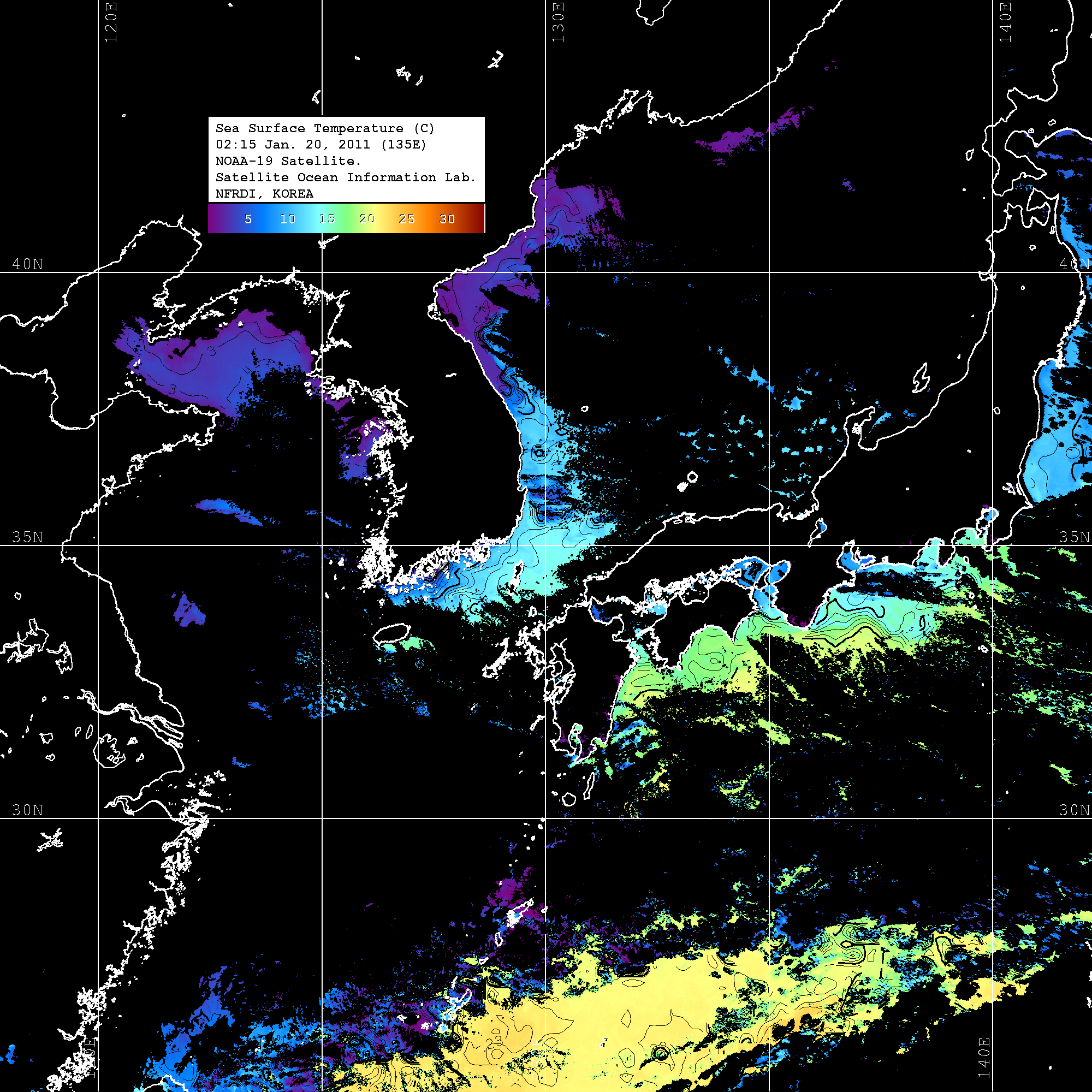o 2011년 01월 20일 02시 15분 NOAA-19호 위성영상입니다. o 수온분포는 범례를 참고하시기 바랍니다. o 검은색은 구름을 나타냅니다. o 그림을 클릭하시면 크게 보실 수 있습니다.