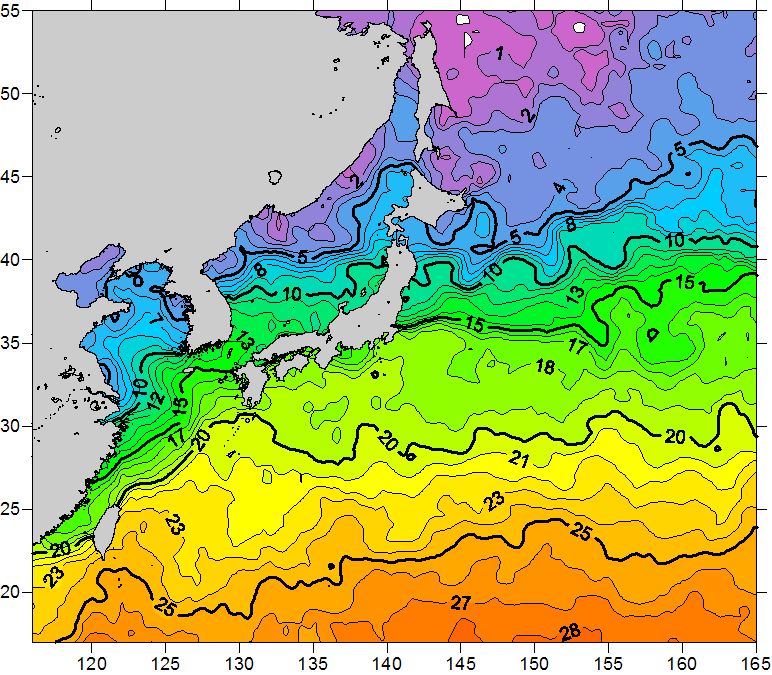 o 2011년 01월 19일 북서태평양 광역해양 수온분포 입니다. o 아래 위성 수온분포도는 국립수산과학원(NFRDI, Korea)과 일본동북대학교 (Tohoku University, Japan)가 공동연구개발 진행중, 1차 연구결과인 것으로 구름의 영향을 배제한 신기술의 수온정보입니다.