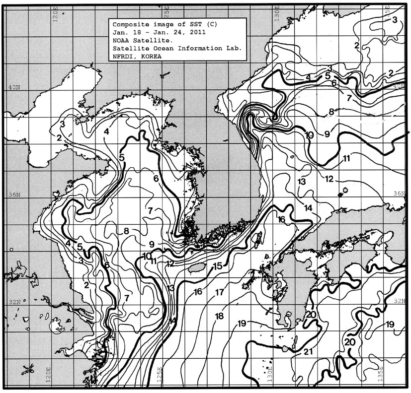 o 금주(2011.01.18~2011.01.24)의 한국근해 표면수온은 대화퇴 근해 7~8도, 울릉도 근해 12~13도, 대마도 근해 15~17도, 제주도 근해 13~15도, 이어도 근해 8~10도, 가거초 근해 9~11도, 어청도 근해 4~5도로 나타납니다. o「평년에 비해」대화퇴 근해 0.9도 낮게, 울릉도 근해 1.0도 높게, 대마도 근해 0.8도 높게, 제주도 근해 0.9도 낮게, 이어도 근해 2.1도 낮게, 가거초 근해 0.4도 낮게, 어청도 근해는 1.8도 낮게 나타납니다. o「전년에 비해」대화퇴 근해 3.5도 낮게, 울릉도 근해 0.5도 높게, 대마도 근해 비슷하게, 제주도 근해 2.5도 낮게, 이어도 근해 1.5도 낮게, 가거초 근해 2.0도 낮게, 어청도 근해는 2.5도 낮게 나타납니다. o 수온 전선대는 우리나라 제주해협에서 대한해협까지 13도를 중심으로 형성됩니다.