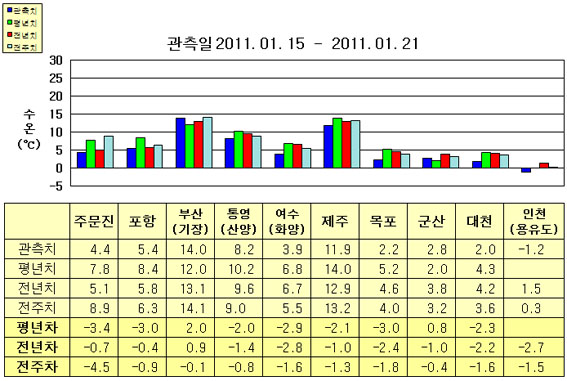 o 금주(2011.01.15~2011.01.21)의 한반도 연안 표면수온은 동해 연안역에서 섭씨 4.0~14.0도, 남해 연안역 3.5~12.0도, 서해 연안역에서 -1.2~3.0도로 나타납니다. o 평년에 비해 부산 2.0도 높음을 제외한 동해 연안역은 3.0~3.5도 낮게, 남해 연안역은 2.0~3.0도 낮게, 군산 0.8도 높음을 제외한 서해 연안역은 2.0~3.0도 낮게 나타납니다. o 전년에 비해 부산(기장) 0.9도 높음을 제외한 동해 연안역은 0.5~1.0도 낮게, 남해 연안역은 1.0~3.0도 낮게, 서해 연안역은 1.0~3.0도 낮게 나타납니다.
