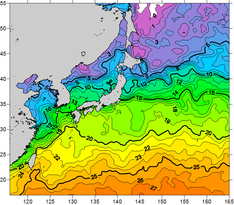 o 2011년 01월 25일 북서태평양 광역해양 수온분포 입니다. o 아래 위성 수온분포도는 국립수산과학원(NFRDI, Korea)과 일본동북대학교 (Tohoku University, Japan)가 공동연구개발 진행중, 1차 연구결과인 것으로 구름의 영향을 배제한 신기술의 수온정보입니다.