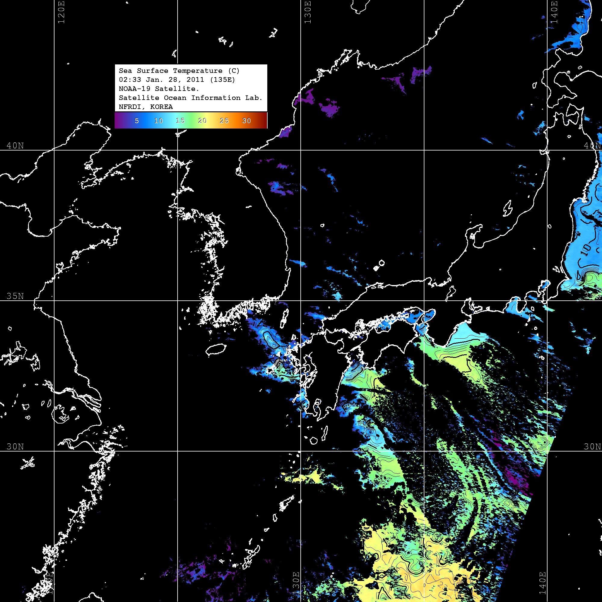 o 2011년 01월 28일 02시 33분 NOAA-19호 위성영상입니다. o 수온분포는 범례를 참고하시기 바랍니다. o 검은색은 구름을 나타냅니다. o 그림을 클릭하시면 크게 보실 수 있습니다.