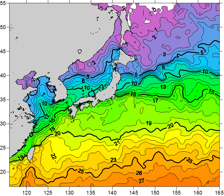 o 2011년 01월 30일 북서태평양 광역해양 수온분포 입니다. o 아래 위성 수온분포도는 국립수산과학원(NFRDI, Korea)과 일본동북대학교 (Tohoku University, Japan)가 공동연구개발 진행중, 1차 연구결과인 것으로 구름의 영향을 배제한 신기술의 수온정보입니다.