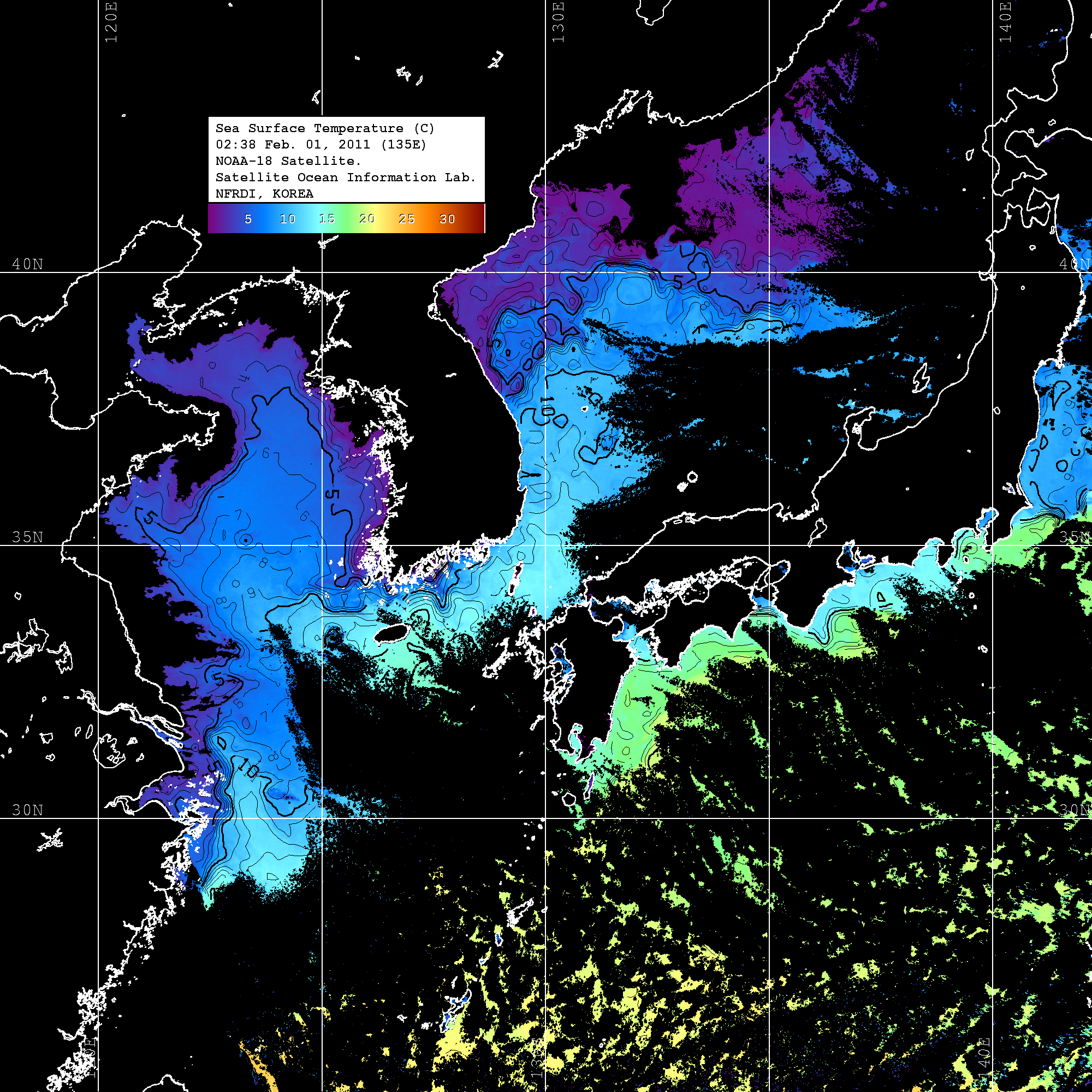 o 2011년 02월 01일 02시 38분 NOAA-18호 위성영상입니다. o 수온분포는 범례를 참고하시기 바랍니다. o 검은색은 구름을 나타냅니다. o 그림을 클릭하시면 크게 보실 수 있습니다.