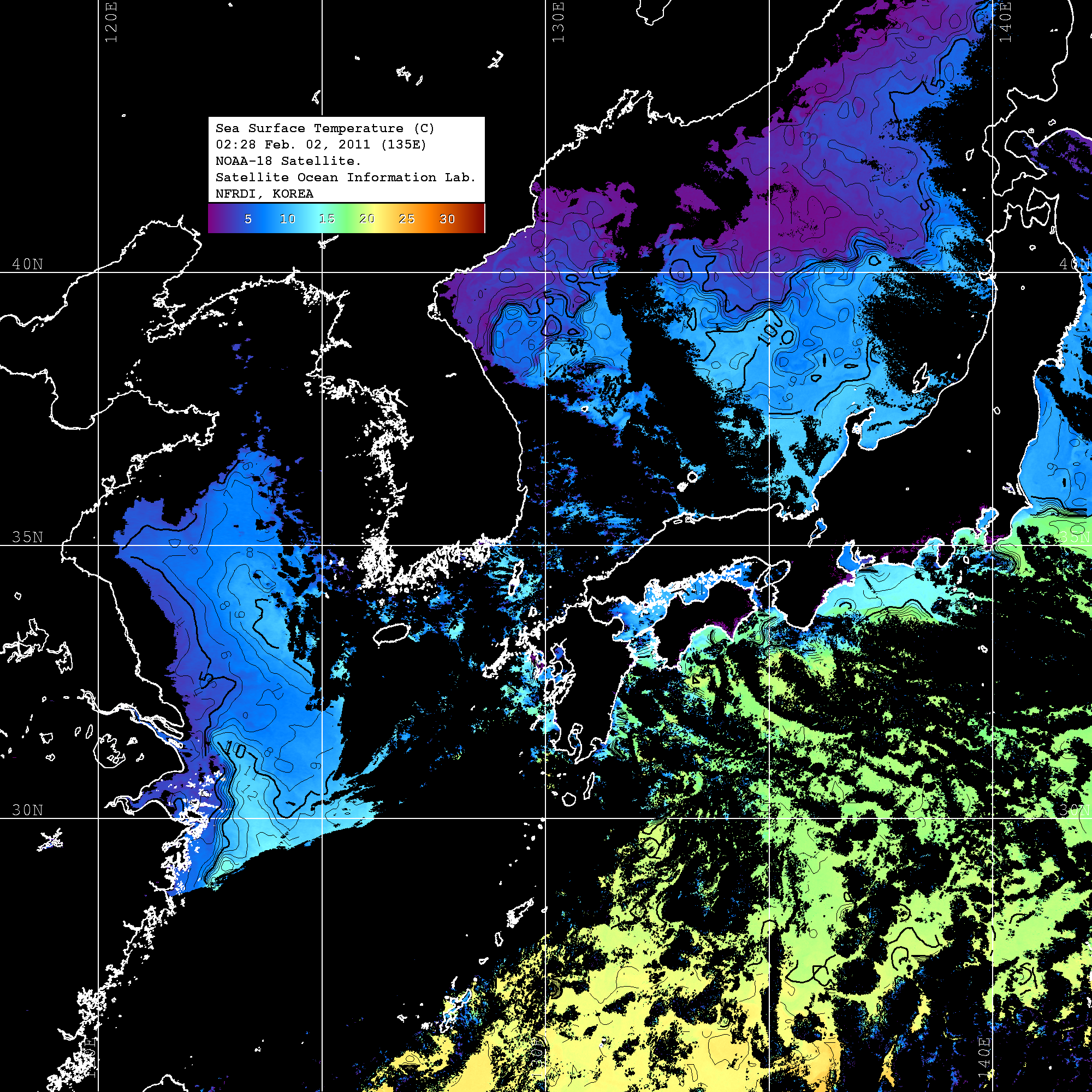 o 2011년 02월 02일 02시 28분 NOAA-18호 위성영상입니다. o 수온분포는 범례를 참고하시기 바랍니다. o 검은색은 구름을 나타냅니다. o 그림을 클릭하시면 크게 보실 수 있습니다.