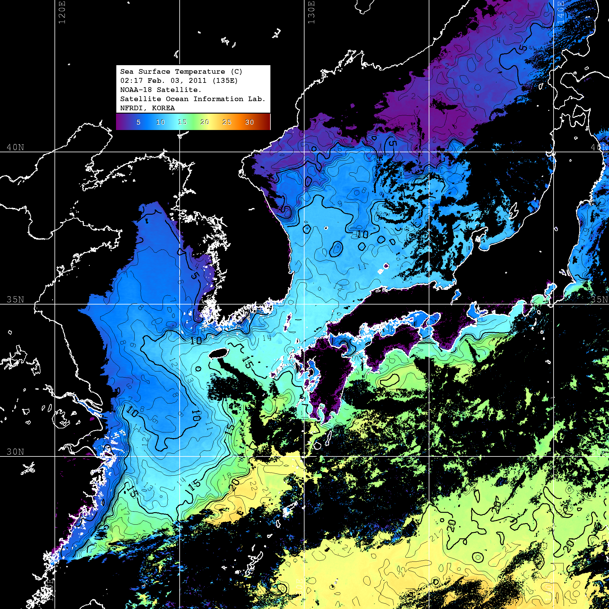 o 2011년 02월 03일 02시 17분 NOAA-18호 위성영상입니다. o 수온분포는 범례를 참고하시기 바랍니다. o 검은색은 구름을 나타냅니다. o 그림을 클릭하시면 크게 보실 수 있습니다.