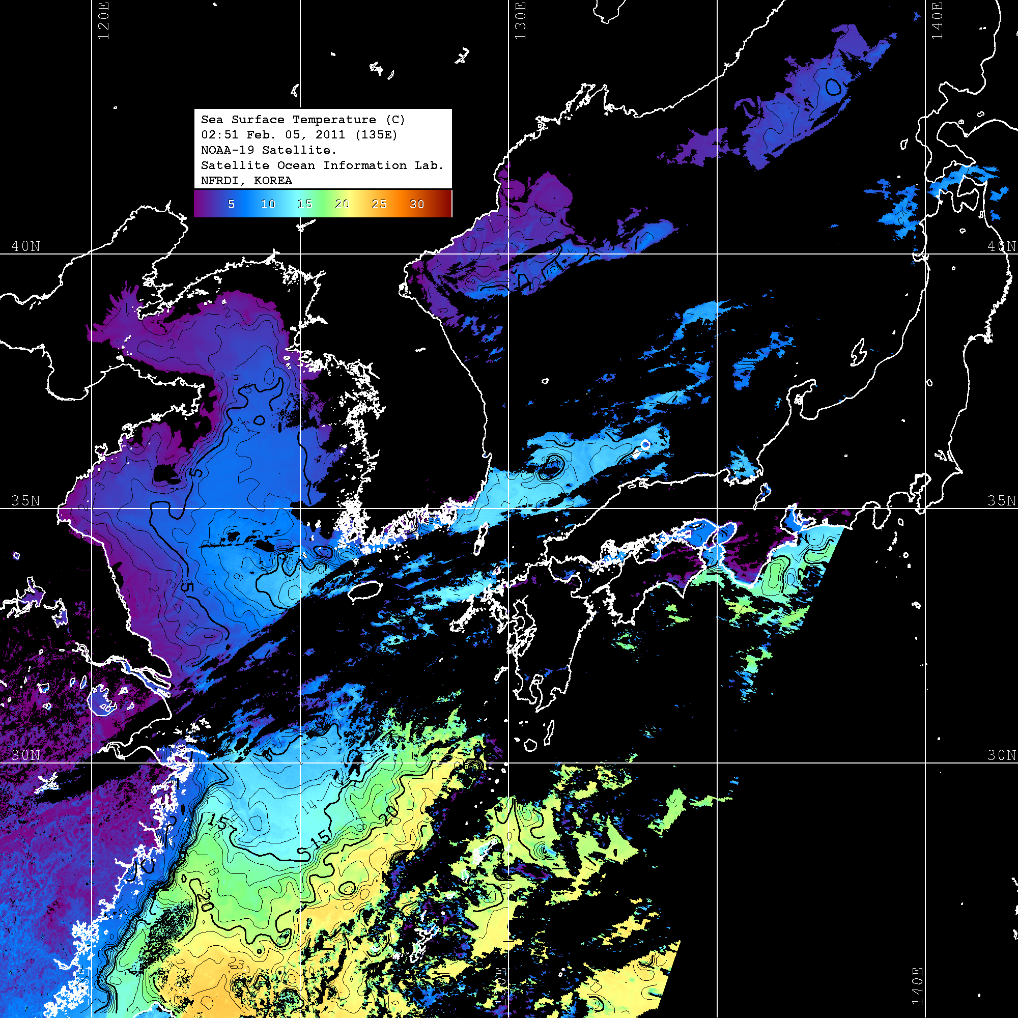 o 2011년 02월 05일 02시 51분 NOAA-19호 위성영상입니다. o 수온분포는 범례를 참고하시기 바랍니다. o 검은색은 구름을 나타냅니다. o 그림을 클릭하시면 크게 보실 수 있습니다.