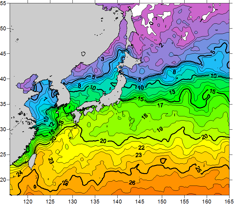 o 2011년 02월 09일 북서태평양 광역해양 수온분포 입니다. o 아래 위성 수온분포도는 국립수산과학원(NFRDI, Korea)과 일본동북대학교 (Tohoku University, Japan)가 공동연구개발 진행중, 1차 연구결과인 것으로 구름의 영향을 배제한 신기술의 수온정보입니다.
